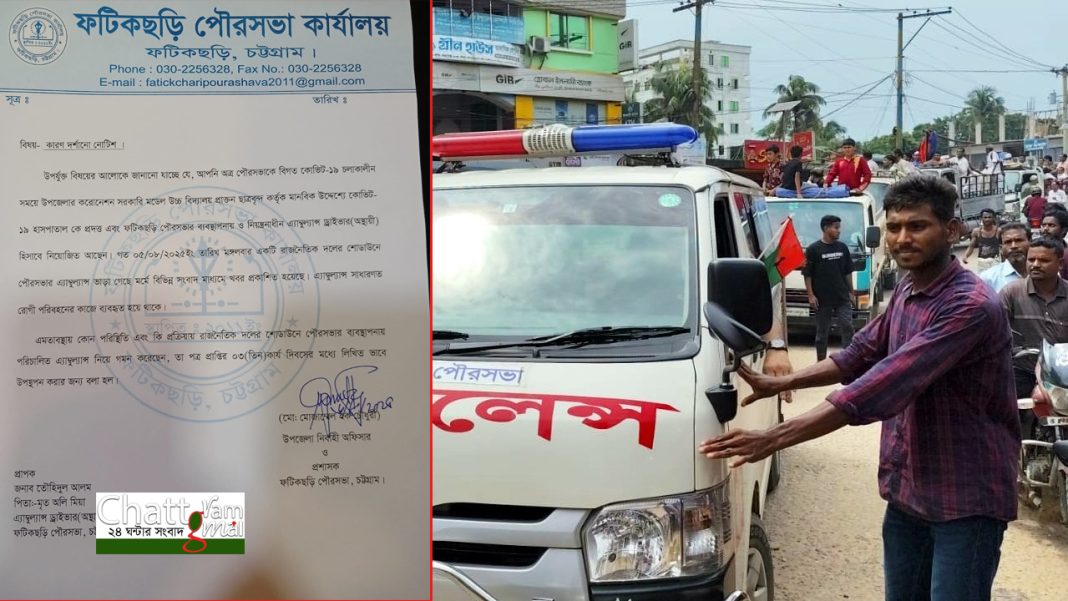 গণ্যমাধ্যমে নিউজ প্রকাশের পর চট্টগ্রামের ফটিকছড়িতে বিএনপির জুলাই গণঅভ্যুত্থান বর্ষপূর্তির শোডাউনে সরকারি অ্যাম্বুলেন্স ব্যবহারের ঘটনায় চালককে শোকজ করেছে পৌরসভা কর্তৃপক্ষ।