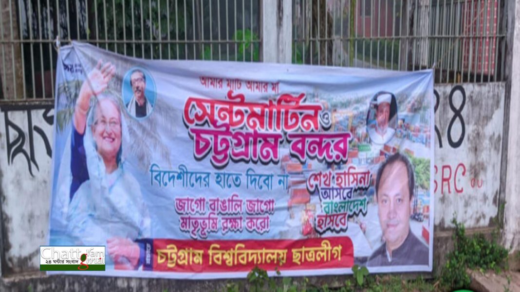 ব্যানারে লেখা ছিল, “আমার মাটি আমার মা, সেন্ট মার্টিন ও চট্টগ্রাম বন্দর বিদেশিদের হতে দেব না। জাগো বাঙালি, জাগো মাতৃভূমি রক্ষা করো। শেখ হাসিনা আসবে, বাংলাদেশ হাসবে।” পাশাপাশি শেখ হাসিনা ও শেখ মুজিবের ছবি, অপর পাশে সাবেক শিক্ষামন্ত্রী মহিবুল হাসান চৌধুরী নওফেল।