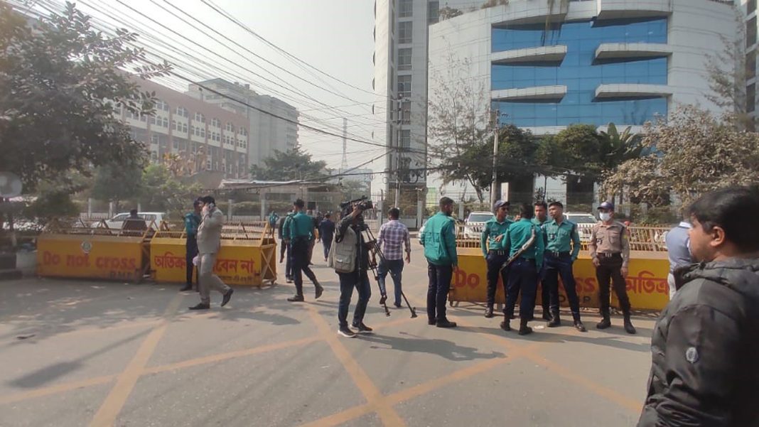 এছাড়া মূল ভবনের সামনেই ব্যারিকেড দিয়ে চলাচল সীমিত করা হয়েছে। সেখানে অতিরিক্ত পুলিশ সদস্য মোতায়েন রয়েছে। যারা ভেতরে প্রবেশ করতে চাইছেন, সবার কাছেই প্রবেশের কারণ জানতে চাওয়া হচ্ছে। প্রাথমিক যাচাই শেষে ভেতরে প্রবেশের অনুমতি মিললেও অস্থায়ী অপেক্ষারতদের বুথ থেকে অডিটোরিয়ামে যেতে আরও দুই ধাপের নিরাপত্তা বলয় অতিক্রম করতে হচ্ছে।