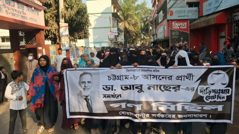 চট্টগ্রাম-৮ আসনে দাঁড়িপাল্লা প্রতীকের প্রার্থী ডা. আবু নাছেরের সমর্থনে বোয়ালখালীতে গণমিছিল অনুষ্ঠিত হয়েছে। নির্বাচনী মাঠ না ছাড়ার ঘোষণা দিয়ে সর্বস্তরের জনসাধারণ এই মিছিলে অংশ নেন।