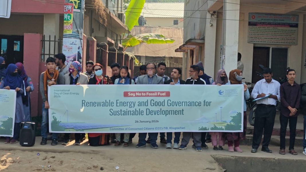 “জীবাশ্ম জ্বালানিকে না বলুন” ক্লিন এনার্জি টেকসই ভবিষ্যৎ গড়ার লক্ষ্যে খাগড়াছড়িতে আন্তর্জাতিক ক্লিন এনার্জি দিবস -২০২৬ উপলক্ষ্যে মানববন্ধন অনুষ্ঠিত হয়। আজ সোমবার সকালে খাগড়াছড়ি প্রেসক্লাবের সামনে সচেতন নাগরিক কমিটি (সনাক) খাগড়াছড়ি জেলা শাখার আয়োজনে জনসচেতনতামূলক মানববন্ধনে অংশ নেন একটিভ সিটিজেন গ্রুপ (এসিজি), ইয়ুথ এনগেজমেন্ট অ্যান্ড সাপোর্ট ( ইয়েস) গ্রুপ সদস্য, নারী কল্যাণ সমিতি, জাবারাং এনজিও সহ বিভিন্ন এনজিও সদস্য ও সাধারণ শিক্ষার্থী’রা।