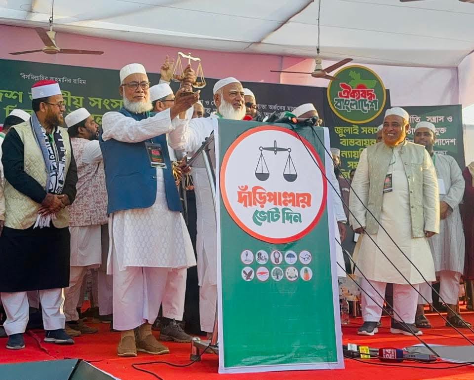চট্টগ্রামের সীতাকুণ্ডে অনুষ্ঠিত জামায়াতে ইসলামীর জনসমাবেশে অধ্যক্ষ মুহাম্মদ নুরুল আমিনের হাতে আনুষ্ঠানিকভাবে নির্বাচনী প্রতীক ‘দাঁড়িপাল্লা’ তুলে দিয়েছেন বাংলাদেশ জামায়াতে ইসলামীর আমীর ডা. শফিকুর রহমান।