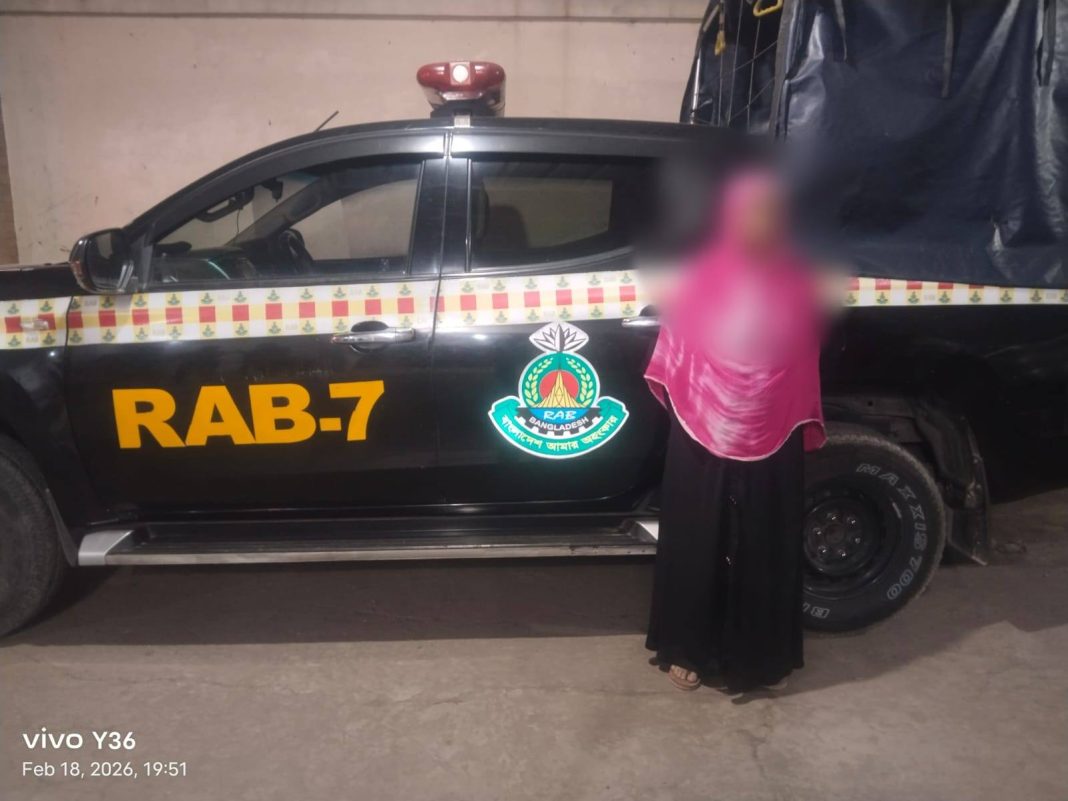 র্যাব সূত্র জানায়, গোপন সংবাদের ভিত্তিতে পরিচালিত অভিযানে ওই নারীকে আটক করা হয়। এ সময় তার কাছ থেকে বিপুল পরিমাণ মাদকদ্রব্য জব্দ করা হয়।