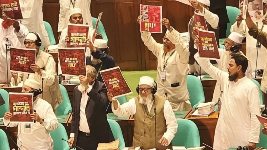 এ সময় বিরোধী দলের সংসদ সদস্যরা দাঁড়িয়ে প্রতিবাদ জানান। তাদের হাতে প্ল্যাকার্ড দেখা যায়। প্ল্যাকার্ডে জুলাই নিয়ে গাদ্দারি চলবে না, জুলাইয়ের সঙ্গে বিশ্বাসযোগ্যতা বন্ধ করসহ বিভিন্ন স্লোগান লেখা রয়েছে। স্পিকার এ সময় সবাইকে শান্ত থাকতে আহ্বান জানান।