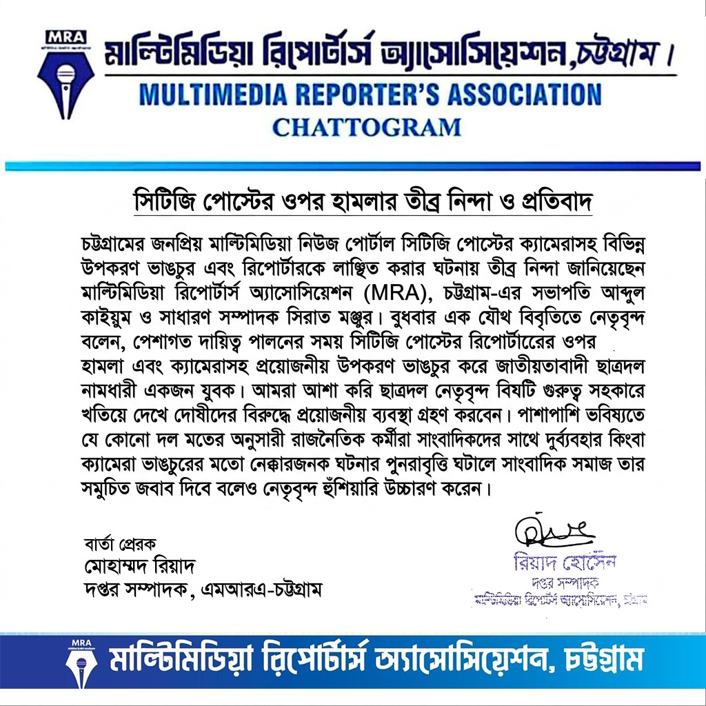 চট্টগ্রামের মাল্টিমিডিয়া নিউজ পোর্টাল ‘সিটিজি পোস্ট’-এর ক্যামেরাসহ বিভিন্ন উপকরণ ভাঙচুর এবং রিপোর্টারকে লাঞ্ছিত করার ঘটনায় তীব্র নিন্দা ও প্রতিবাদ জানিয়েছে মাল্টিমিডিয়া রিপোর্টার্স অ্যাসোসিয়েশন (এমআরএ), চট্টগ্রাম।